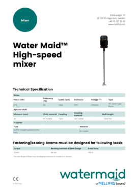Mixers and agitators used for mixing, pH control and flocculation in WaterMaid AquaFloc particle removal sedimentation systems.